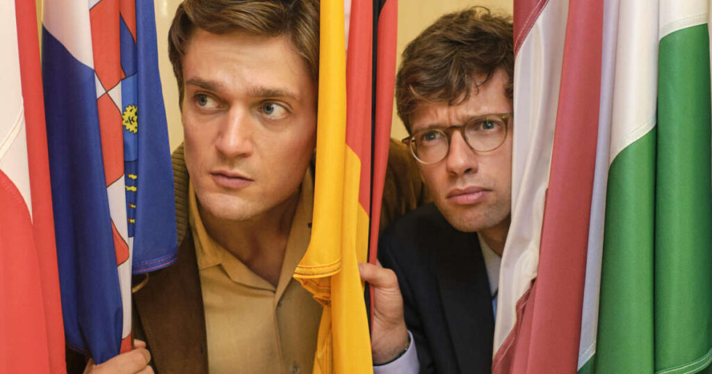 L’Allemand Torsten (Lucas Englander) et le Français Samy (Xavier Lacaille) dans les arcanes du Parlement européen. Photo Benoît LINDER/Cinétévé/FTV Slash