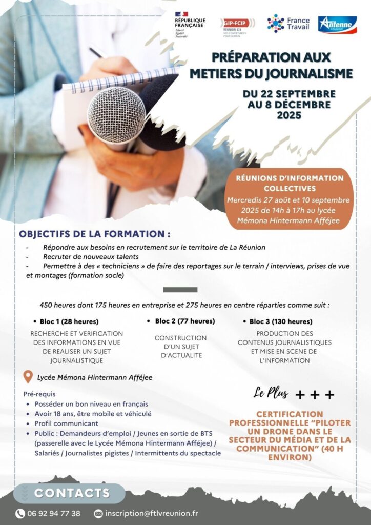 Le GIP FCIP, en collaboration avec France Travail La Réunion et Antenne Réunion, propose une nouvelle formation dédiée aux métiers du journalisme.
