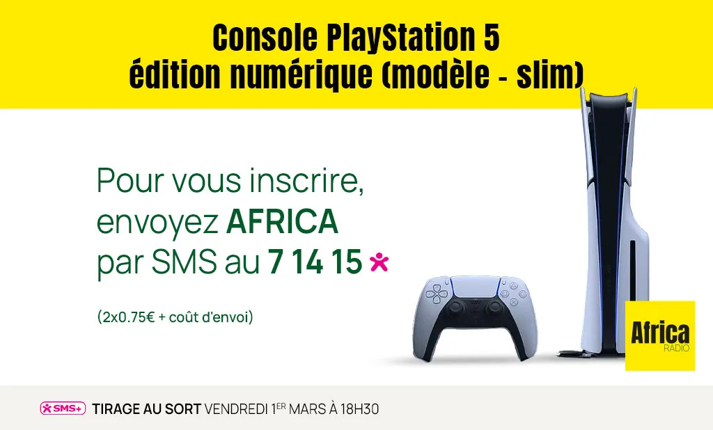 Pour participer au jeu et tenter de gagner une PlayStation 5 édition numérique, il vous suffit d’envoyer par SMS le code AFRICA au 7 14 15. Veuillez noter que l’envoi de ce message vous sera facturé 2 fois 75 centimes, en plus du coût d’envoi standard.